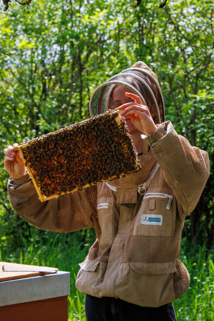 (Quelle: Marlene Rase, Honigmanufaktur Bliesgau – auf den Bildern zu sehen: Marlene Rase und ihr Vater Christian Spieldenner, und die Bienen 🙂 )