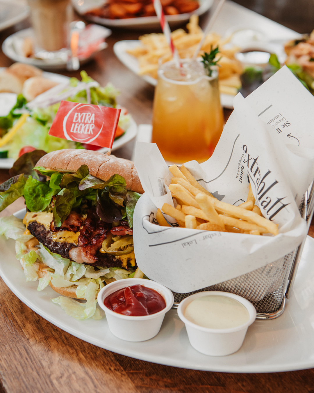 It’s Extrablatt o`Clock: Es gibt Angebote rund um die Uhr und das an 365 Tagen im Jahr. Hervorragende Kaffeespezialitäten, trendige Szenedrinks, leckere Cocktails und um den Gästen immer wieder neue Geschmackserlebnisse bieten zu können, wird das Sortiment regelmäßig um saisonale Highlights erweitert. Die abwechslungsreiche Küche, die täglich von früh bis spät den kleinen und großen Hunger stillt, bietet ein umfangreiches Angebot. Ob Frühstück, warme Gerichte für den Mittagstisch, extraleckere Schnitzel, eine große Burgerauswahl, Salate oder einfach eine Currywurst – hier ist für jeden Geschmack etwas dabei – und das von Früh bis Bier!