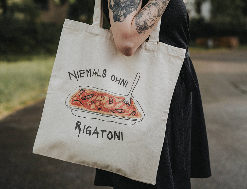 Liegt der Rigatoni-Kult also an der Saarbrücker Bevölkerungsstruktur – an der Mischung aus Studierenden, Kreativen, Geringverdienern und einer kaum noch vorhandenen Industrie? Wirklich erklären lässt sich das wohl nicht. Schließlich gibt es genug strukturschwache Regionen in Deutschland, die gänzlich ohne rot-weiße Sauce und Doppelkäse auskommen. Saarbrücken aber hat seine Rigatoni ins Herz geschlossen – so sehr, dass es längst Merchandise rund um die Nudel gibt. Für alle, denen das Gericht allein nicht reicht, gibt es T-Shirts, Tassen und Taschen mit Kultpotenzial. Sogar ein eigenes Emoji hat die Aluschale bereits vor sieben Jahren im Rahmen der „Saarmojis“ für Android und iOS bekommen – und wer weiß: Vielleicht ist das der wahre Ritterschlag der Popkultur. Zu verdanken ist vieles der Saarbrücker Grafikdesignerin Danielle Deckert, die sich auch mit ihrem Label der ikonischen Nudel gewidmet hat. Auf ihren Produkten steht ein Satz, mit dem man echte Saarbrückerinnen und Saarbrücker sofort erkennt: „Niemals ohni Rigatoni.“